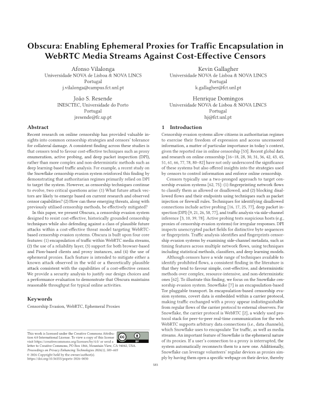 Abstract: Recent research on online censorship has provided valuable insights into common censorship strategies and censors' tolerance for collateral damage. A consistent finding across these studies is that censors tend to favour cost-effective techniques such as proxy enumeration, active probing, and deep packet inspection (DPI), rather than more complex and non-deterministic methods such as deep learning-based traffic analysis. For example, a recent study on the Snowflake censorship evasion system reinforced this finding by demonstrating that authoritarian regimes primarily relied on DPI to target the system. However, as censorship techniques continue to evolve, two critical questions arise: (1) What future attack vectors are likely to emerge based on current research and observed censor capabilities? (2) How can these emerging threats, along with previously utilised censorship methods, be effectively mitigated? In this paper, we present Obscura, a censorship evasion system designed to resist cost-effective, historically grounded censorship techniques while also defending against a class of plausible future attacks within a cost-effective threat model targeting WebRTC-based censorship evasion systems. Obscura is built upon four core features: (1) encapsulation of traffic within WebRTC media streams, (2) the use of a reliability layer, (3) support for both browser-based and Pion-based clients and proxy instances, and (4) the use of ephemeral proxies. Each feature is intended to mitigate either a known attack observed in the wild or a theoretically plausible attack consistent with the capabilities of a cost-effective censor. We provide a security analysis to justify our design choices and a performance evaluation to demonstrate that Obscura maintains reasonable throughput for typical online activities.
